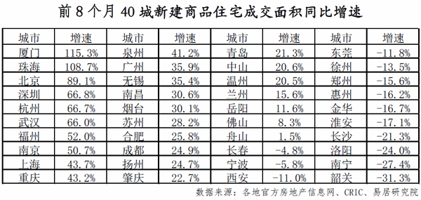 从40城新建商品住宅成交面积年初累计同比增速排名情况来看,前十的城市依次为:厦门、珠海、北京、深圳、杭州、武汉、福州、南京、上海、重庆。其中,厦门8月新房成交面积环比增长28.9%,同比大增81.6%,前8个月累计同比增速为115.3%,位居40城之首。珠海前8个月同比大增108.7%,主要原因是去年同期基数较低,且今年以来新房成交火热,呈明显的供不应求状态。