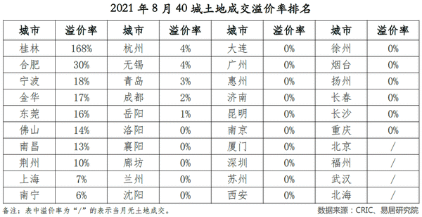 此外,土地成交溢价率排名前5的城市分别为桂林、合肥、宁波、金华和东莞,土地成交溢价率分别为168%、30%、18%、17%和16%。其中,桂林溢价率异动主要因当月只有两块地块成交,其中一块土地溢价率过高导致。在易居研究院看来,多地土拍溢价率已连续几个月为0,土拍新规控地价和溢价率的效果非常明显。