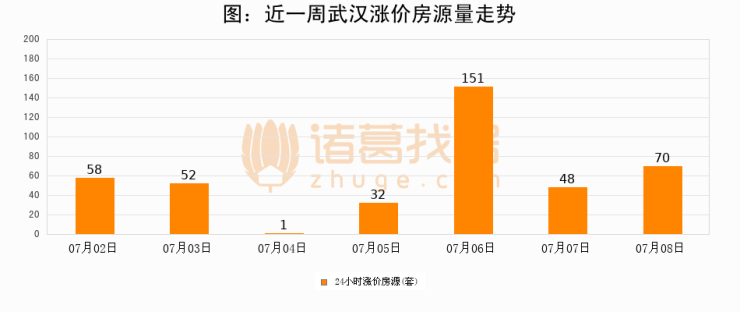 根据诸葛找房数据显示,武汉24小时涨价房源量为70套,较07月07日增加22套,环比上涨45.8%。与此同时,涨价房源占比小幅扩大,业主信心有所提升。