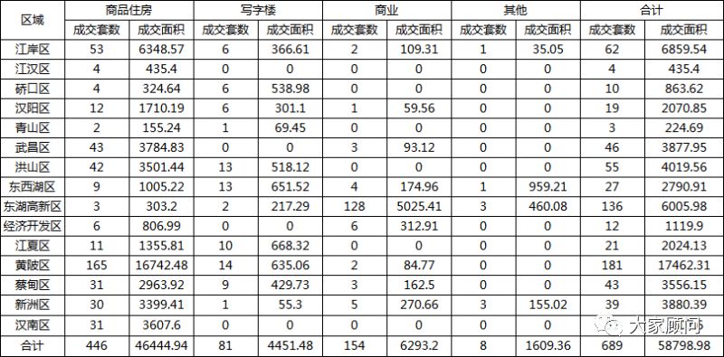 据武汉房地产市场信息网数据显示:8月22日武汉市新建商品房共成交689套,成交面积58798.98平米。其中新建商品住房成交446套,成交面积46444.94平米,黄陂区165套居首;写字楼成交81套,成交面积4451.48平米,商业成交154套,成交面积6293.2平米;其他成交8套,成交面积1609.36平米。