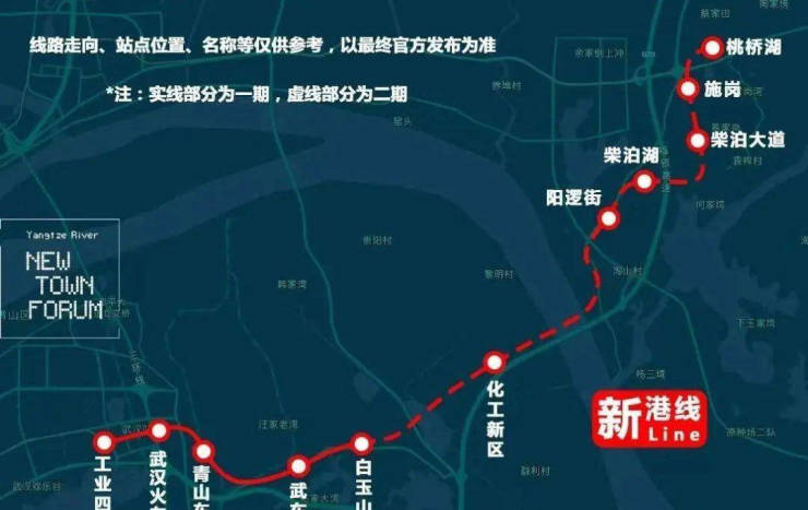 根据国家发改委批复的武汉市轨道交通第四期建设规划,武汉轨道交通新港线起于杨春湖片区工业四路站(或北洋桥站,具体以开通名称为准),沿线经武汉火车站、白玉山片区、化工新城,下穿长江后途经阳逻老城区以及规划阳逻新城,止于桃桥湖,分两期建设。