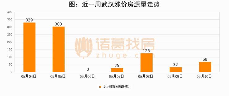 根据诸葛找房数据显示,武汉24小时涨价房源量为68套,较05月09日增加36套,环比上涨112.5%。与此同时,涨价房源占比小幅扩大,业主信心有所提升。