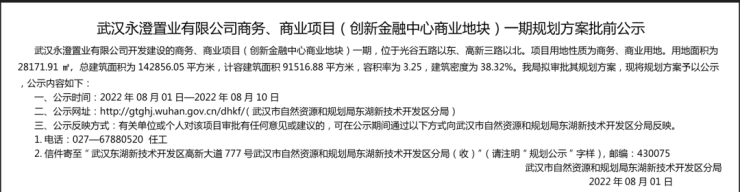 8月2日消息,搜狐焦点获悉,据悉,光谷创新金融中心商业地块一期规划方案批前公示。