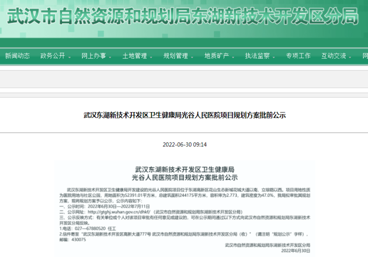6月30日,武汉市自然资源和规划局东湖新技术开发区分局发布《武汉东湖新技术开发区卫生健康局光谷人民医院项目规划方案批前公示》(以下简称《公示》)。
