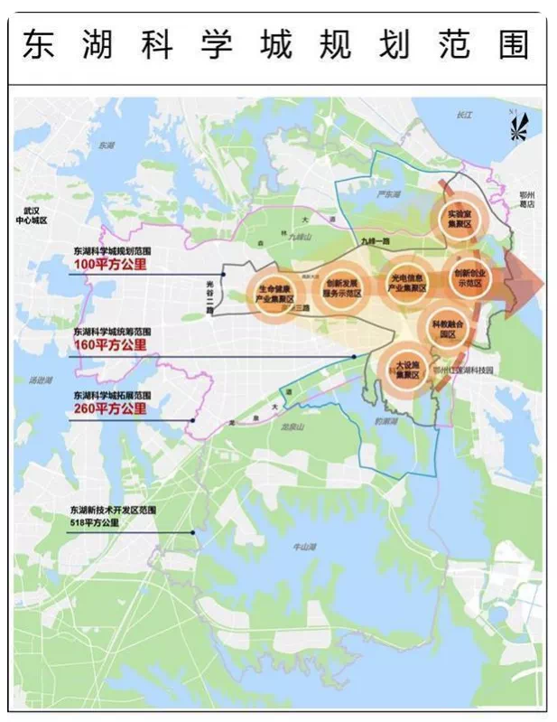 据悉,东湖科学城规划范围100平方公里、统筹范围160平方公里、拓展范围260平方公里,横向依托高新大道、纵向依托未来大道建设。