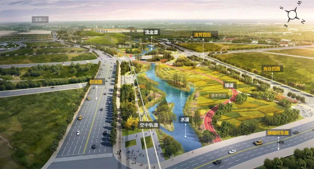 光谷生态大走廊三道整体布局:水道居中,绿道居西,空中轨道居东。