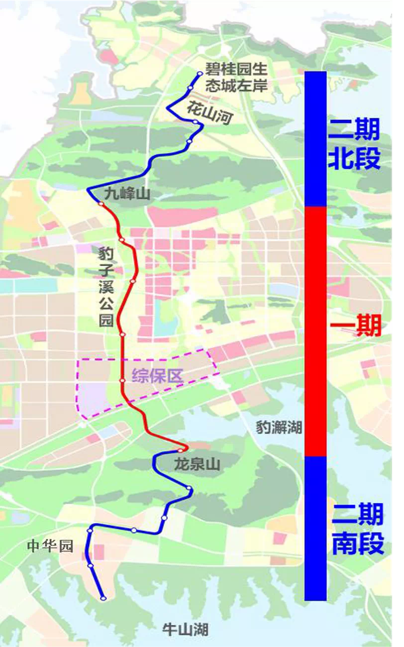 一期工程(九峰山动物园-龙泉山风景区),长10.5公里,设站6座,车辆基地1处;二期工程在一期基础上,向北连接严西湖、严东湖,向南连接豹澥湖、牛山湖。