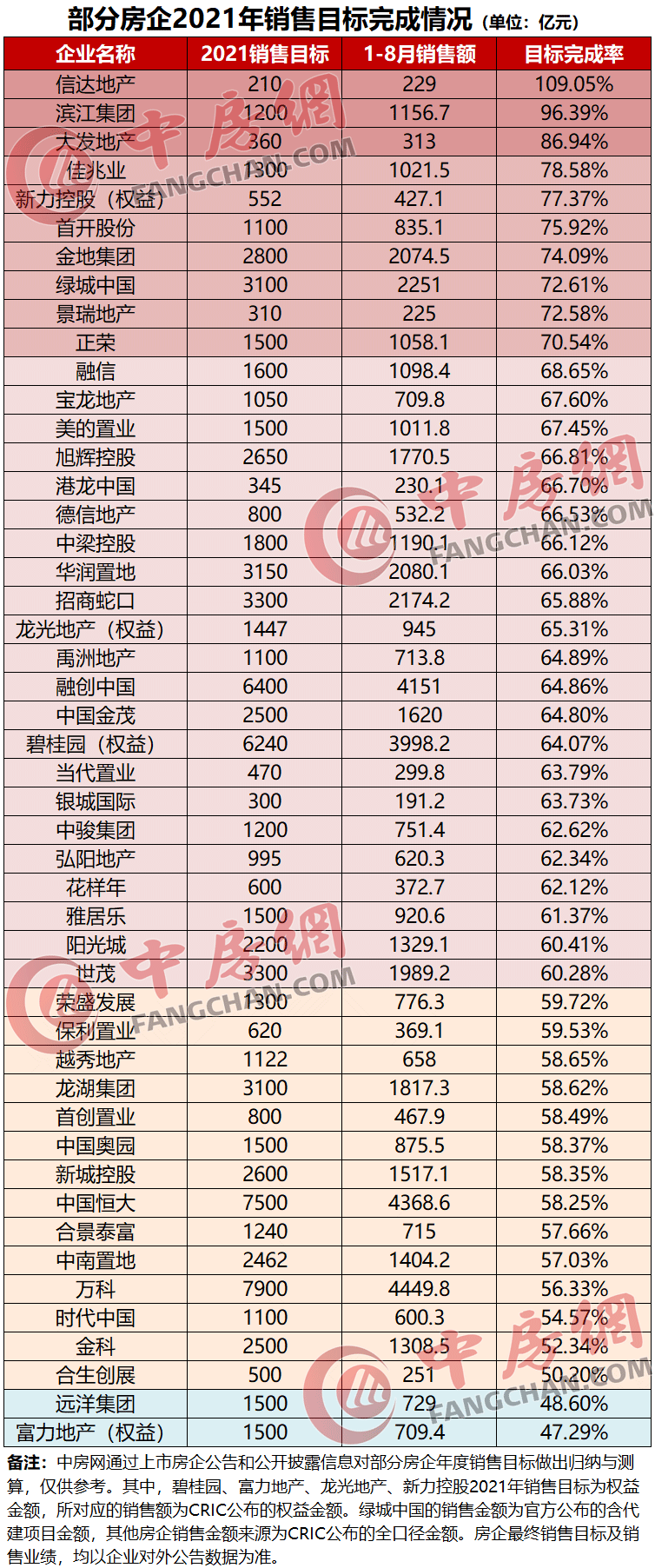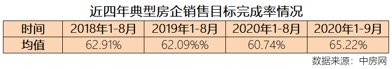 根据中房网不完全统计,本期纳入已公布2021年销售目标的典型房企数量为48家,结合房地产企业销售数据测算,1-8月份典型房企销售目标完成率均值为65.22%。