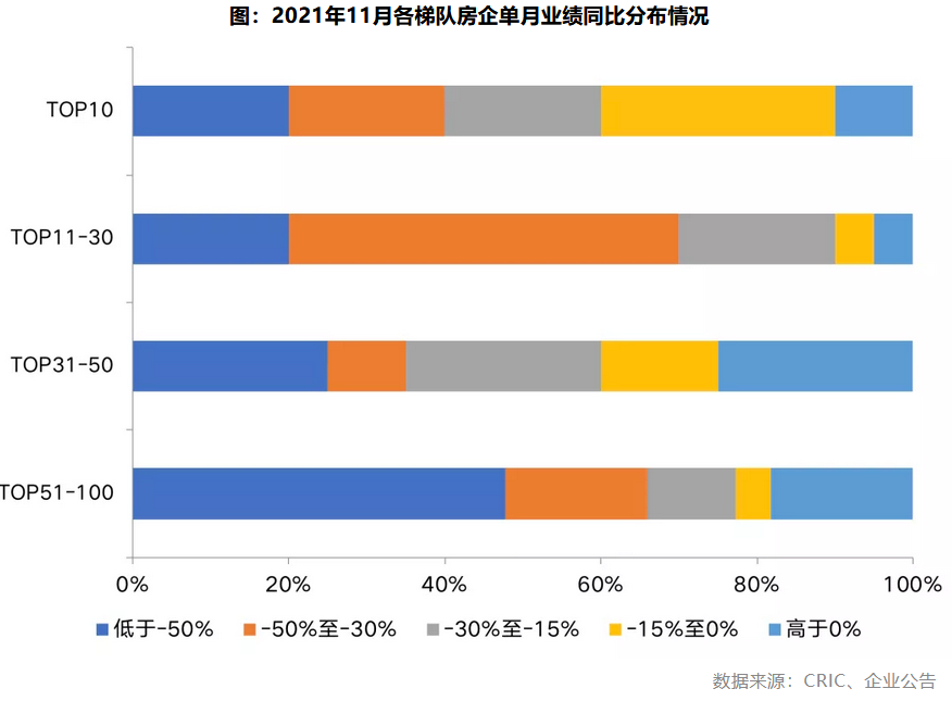 值得注意的是,2021年11月百强房企中逾8成企业单月业绩同比降低,其中超过半数的房企同比降幅大于30%。同时,包括绝大部分TOP30房企在内,有近9成企业单月业绩不及上半年月均水平。