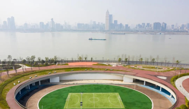 月亮湾城市阳台是一个分层立体平台联动的建筑、景观和慢行系统。据了解,一期工程中有8个这样的异形大台阶。背江的2号台阶又有奥妙不同,台阶设计错落有致,中段阶梯供人步行或休憩,过渡到两端变成绿化带,种满狼尾草、细叶芒、麦冬等植物,层层叠叠煞是热闹。刘为称,这是武汉市较大的曲面异形水磨石台阶,“现在草还有点黄,开春了特别漂亮。市民在这休息时,能近距离赏生机勃勃的花花草草。”