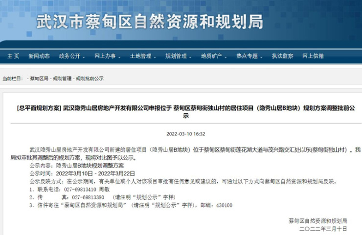 搜狐焦点“楼市快讯”报道:近日,搜狐焦点从武汉市蔡甸区自然资源和规划局获悉,由武汉隐秀山居房地产开发有限公司申报位于 蔡甸区蔡甸街独山村的居住项目(隐秀山居B地块)规划方案调整批前公示。《公示》显示,该地块位于位于蔡甸区蔡甸街莲花湖大道与茂兴路交汇处以东(蔡甸街独山村),公示时间为2022年3月10日-2022年3月22日。