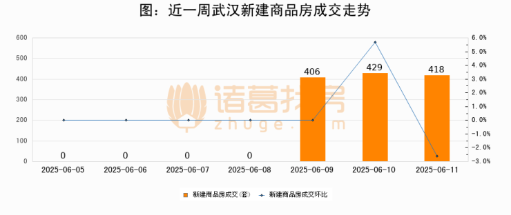 根据武汉市住房保障和房屋管理局数据显示,2025年06月11日武汉新建商品房成交418套,较昨日减少11套,环比下降2.6%