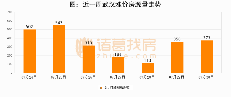 根据诸葛找房数据显示,武汉24小时涨价房源量为373套,较07月29日增加15套,环比上涨4.2%。与此同时,涨价房源占比小幅扩大,业主信心有所提升。