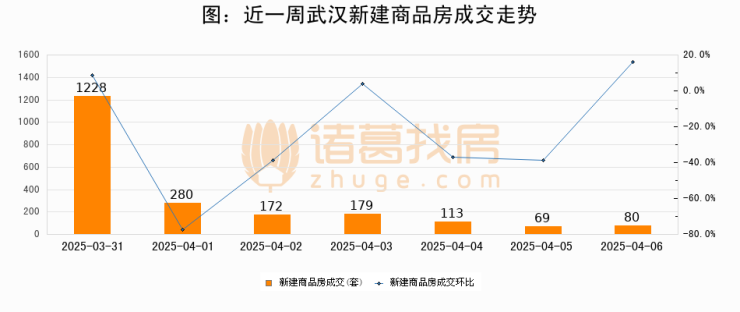 根据武汉市住房保障和房屋管理局数据显示,2025年04月06日武汉新建商品房成交80套,较昨日增加11套,环比上涨15.9%