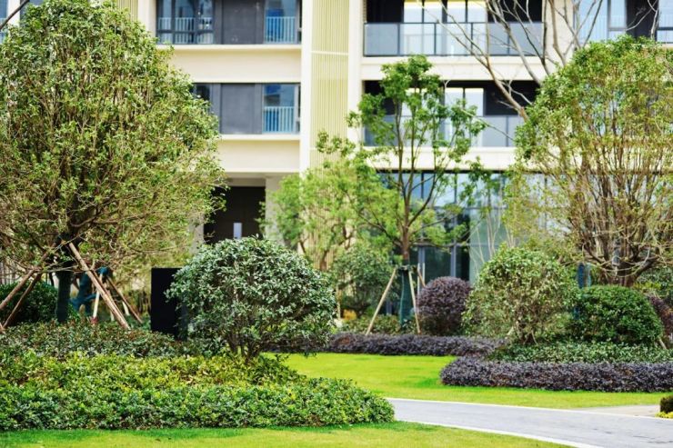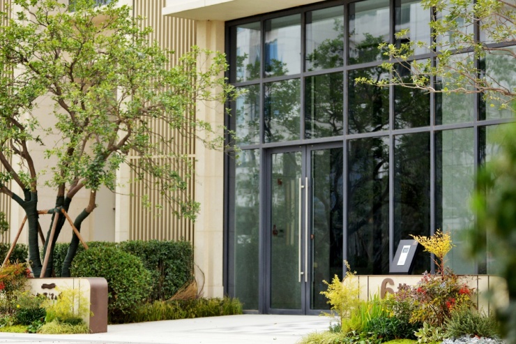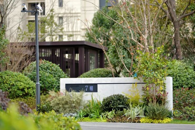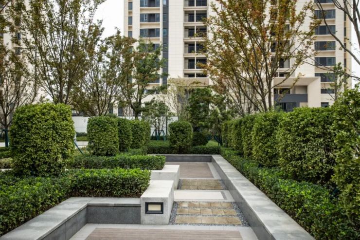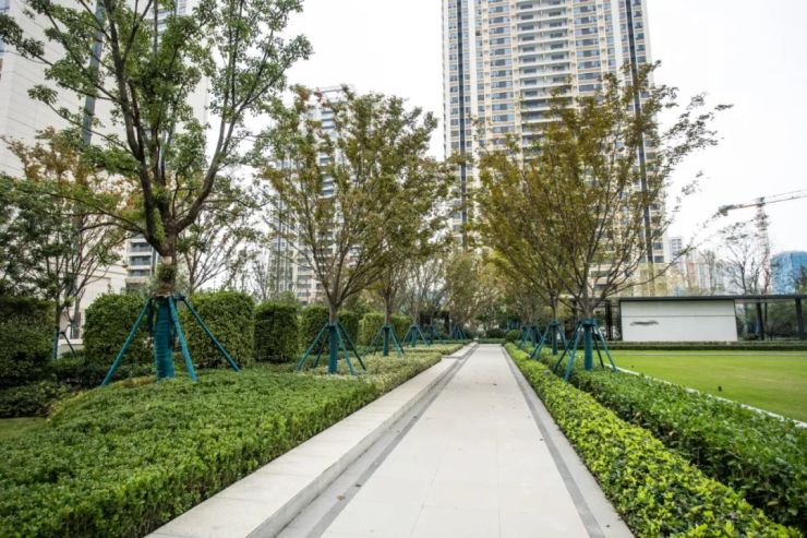整个社区抬高于地面2米修建,由威仪的大门进入,入眼便是以中轴对称打造的朴树树阵,步道两侧对称摆放全冠移植的,胸径相同的榉树,与水景共同在阳光的照耀下,仪式感与品质感油然而生。