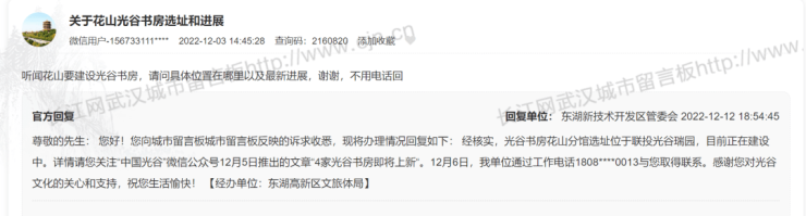 近日,有网友询问花山建设光谷书房的进展和选址,官方回复如下: