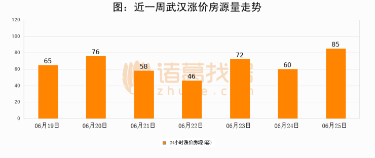 根据诸葛找房数据显示,武汉24小时涨价房源量为85套,较06月24日增加25套,环比上涨41.7%。与此同时,涨价房源占比小幅扩大,业主信心有所提升。