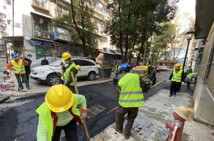 3月15日消息,搜狐焦点获悉,在汉阳碧溪苑老旧小区改造施工现场,10多名施工人员推平刷黑地面的沥青。