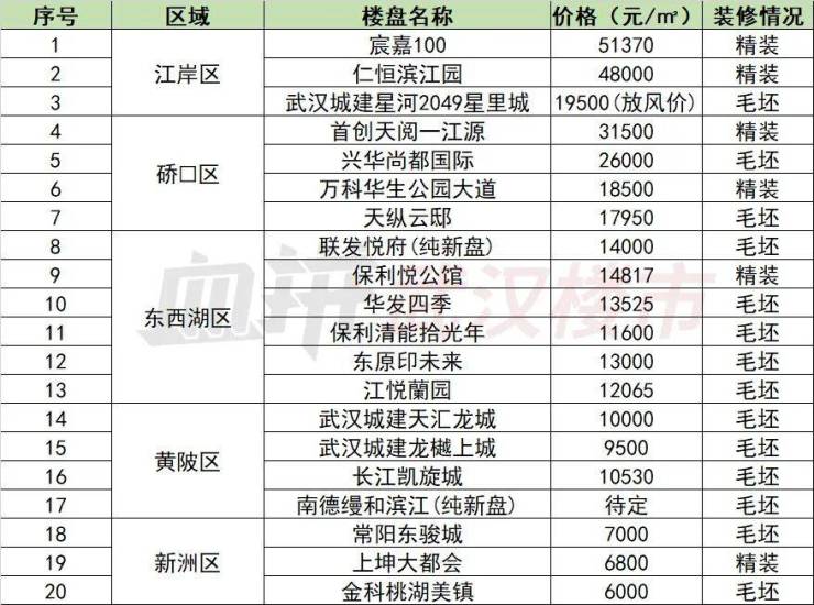 其中江岸区后湖板块武汉城建星河2049推售新地块,80-140㎡二至四房高层产品,毛坯均价19500元/㎡。