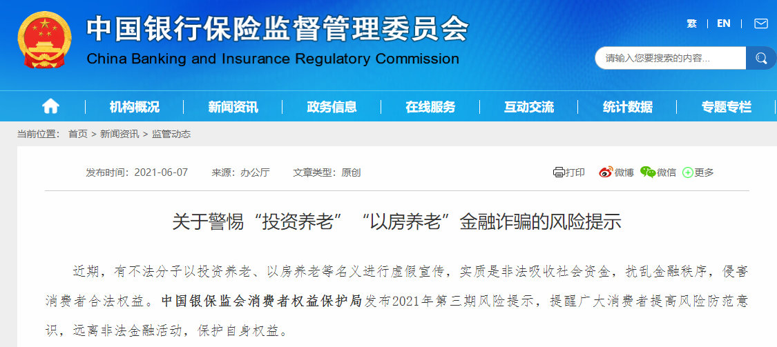 今日,银保监会网站发布关于警惕“投资养老”“以房养老”金融诈骗的风险提示。