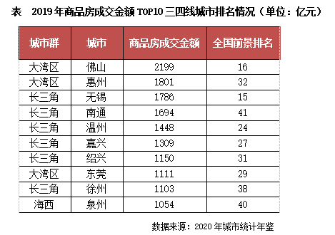综合各类指标来看,三四线城市中投资前景较好的城市仍然集中在长三角和大湾区两大城市圈。单从2019年商品住宅成交金额来看,排名靠前的除泉州外,其余9个城市均来自大湾区和长三角两大城市群。其中大湾区共有3个城市进入前20,分别是佛山、惠州和东莞,佛山的商品住宅成交金额更是高达2199亿元,高居三四线城市商品住宅成交金额榜首,并进入全国TOP20;长三角入榜城市最多,共占6席,并且这些城市商品住宅成交金额均超过了1000亿元,且较上一年基本都是上涨的,无锡、南通和徐州等成交金额靠前的城市同比涨幅均在20%以上,楼市表现较好。