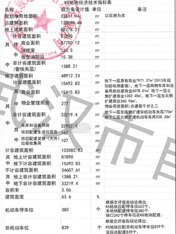 根据规划公示显示,武汉SKP总建筑面积138190平方米,地上商业面积87750.12平方米,地下商业面积15415.83平方米,容积率为3.06,建筑密度为63.6%,机动停车位380个,非机动停车位839个。