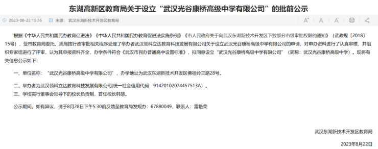 搜狐焦点获悉,近日,东湖高新区教育局关于设立“武汉光谷康桥高级中学有限公司”的批前公示。