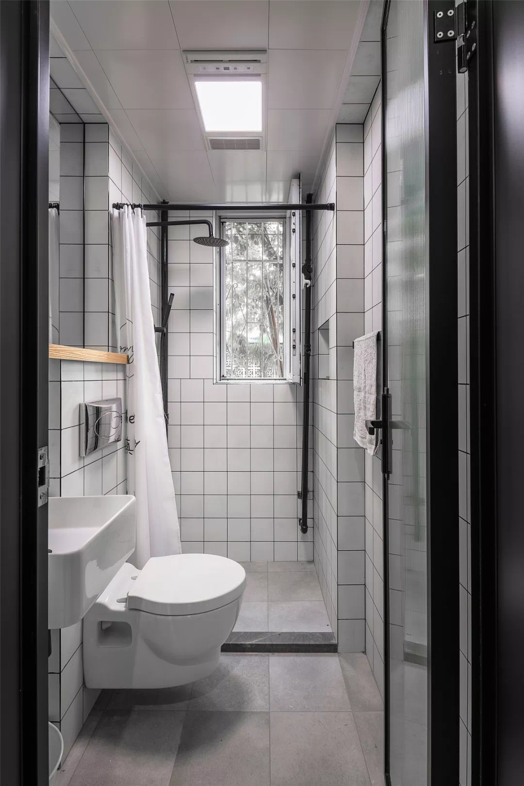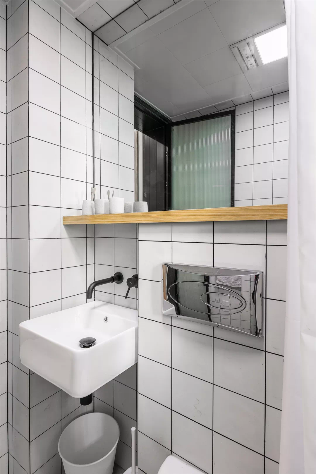 从原始无处安放的卫浴洁具到安排的妥妥当当的面盆,壁挂马桶,以及淋浴区的过程中都是设计师抠出来的尺寸,淋浴区的壁龛的设计能承载大大小小的洗浴用品。
