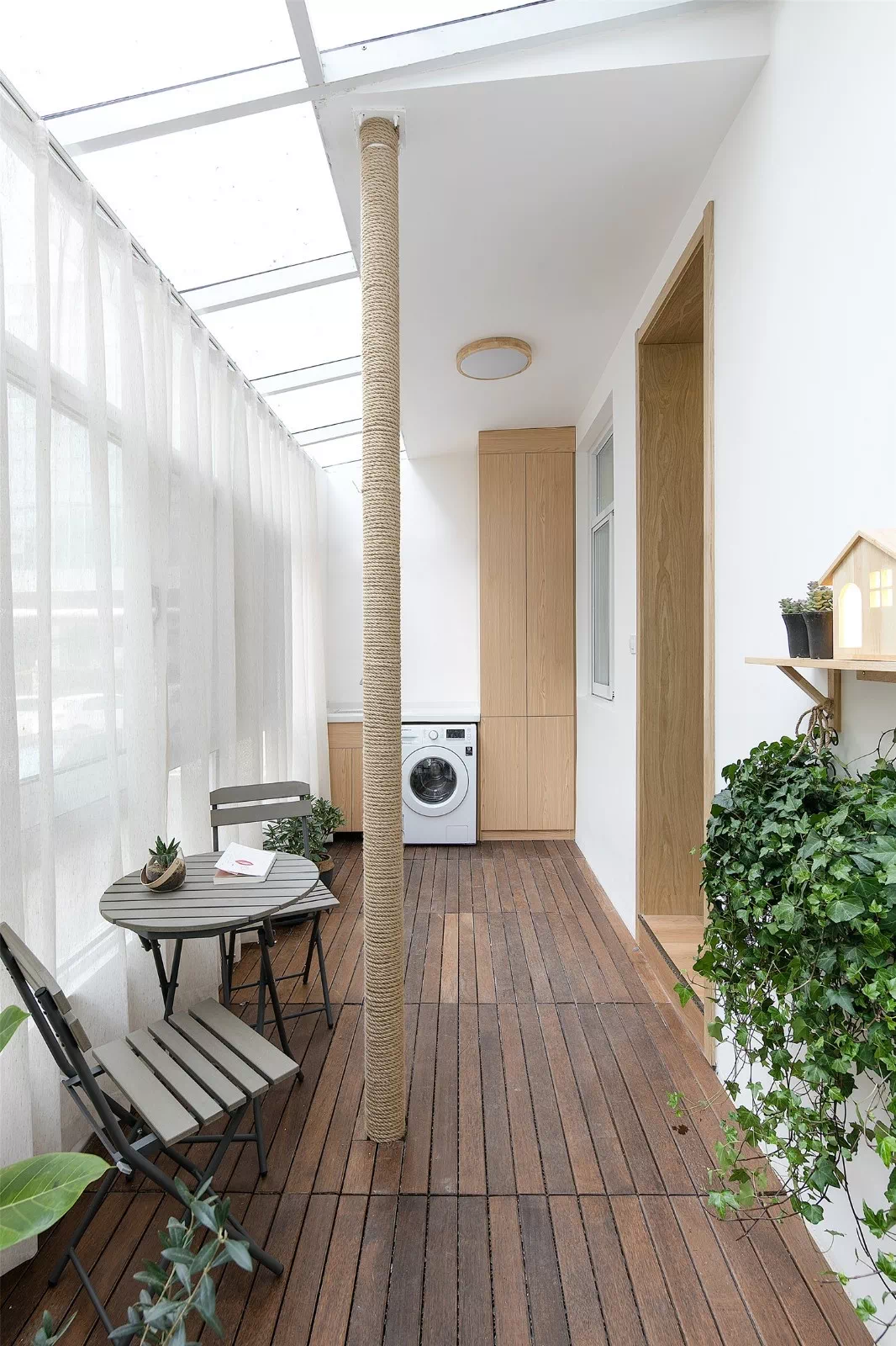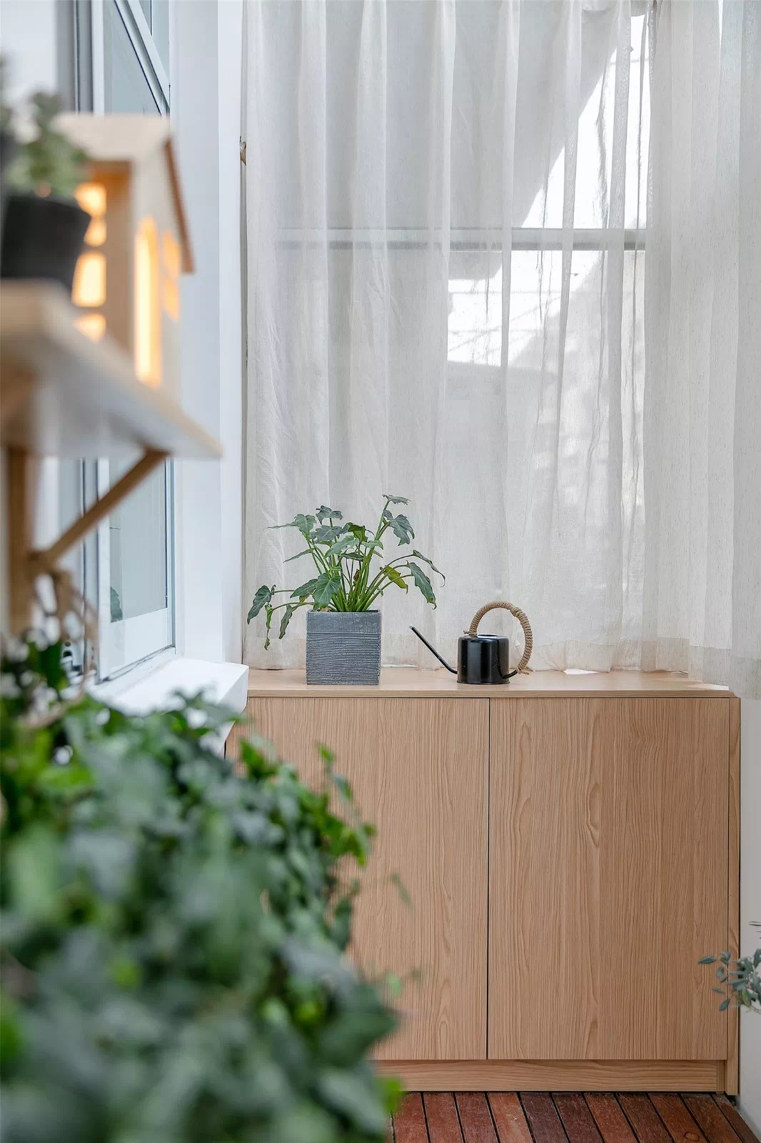 将空调外机放置在阳光房以外,利用空余的空间做了一组收纳矮柜,补给家里收纳的需求。