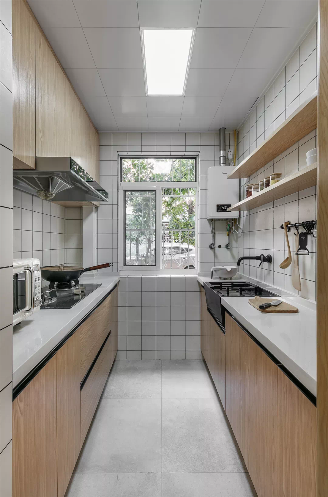 改造之后的卧室,内嵌大衣柜柜门同样选用原木色与整体格调保持一致,使主卧拥有它本该有的收纳和清爽。厨 房