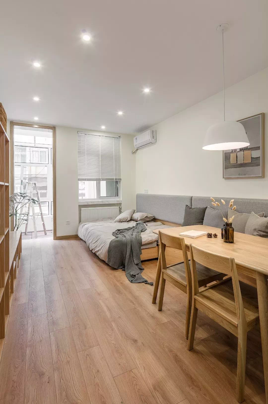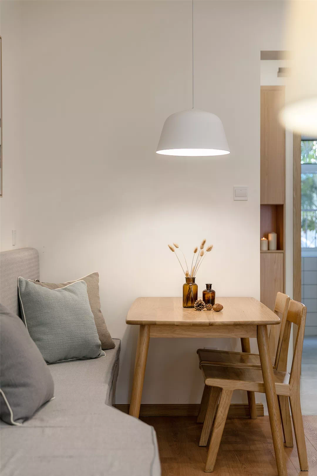 自带无印风的色系,既定了从容而安定的生活基调。餐 厅餐厅采用和客厅沙发一体式的卡座,满足了小户型在使用功能上的缺憾,也能达到小空间中视觉延伸的效果。