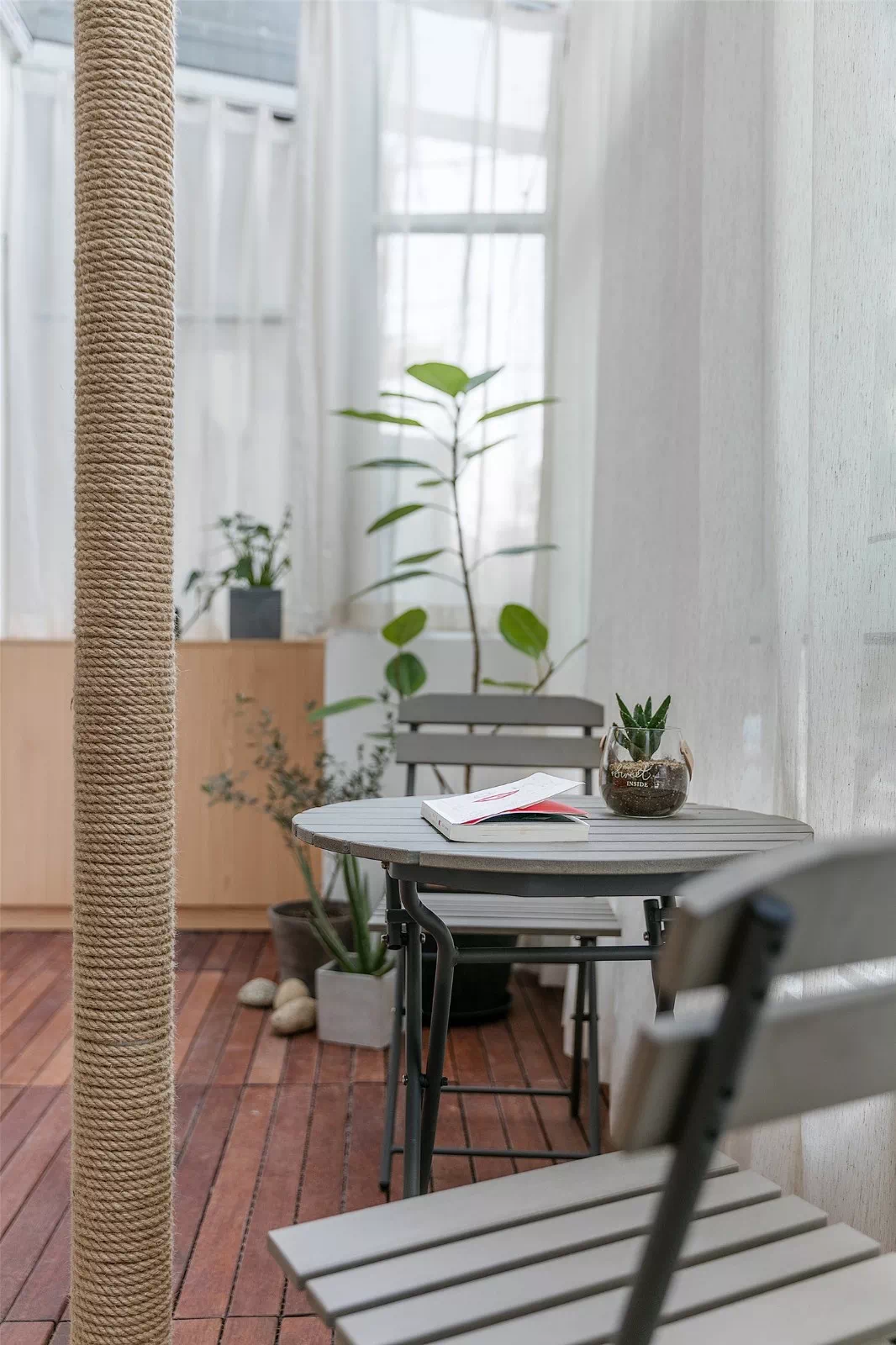 原结构裸露的下水管正好是在阳台正中位置,用麻绳缠绕水管代替用传统的包水管的手法,原本的痛点却成了点缀空间的很重要的一部分。