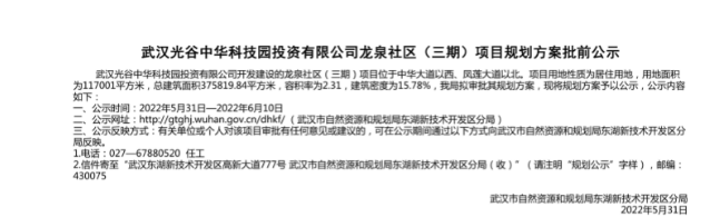 6月5日消息,搜狐焦点获悉,5月31日,武汉市自然资源和规划局东湖新技术开发区分局发布,武汉光谷中华科技园投资有限公司龙泉社区(三期)项目规划方案批前公示。