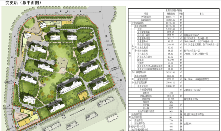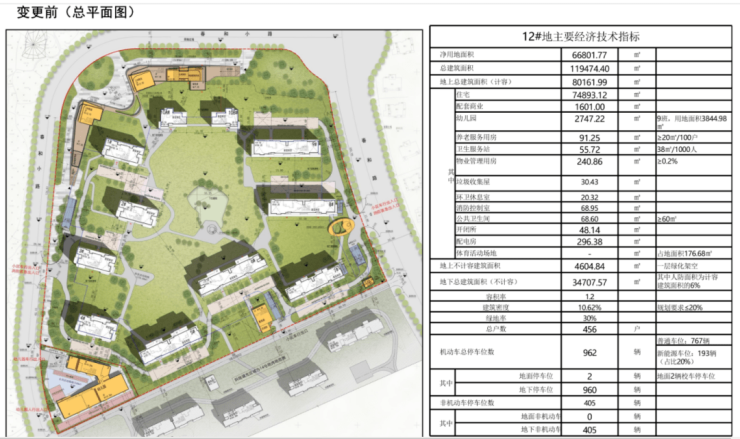 变更后,12号地净用地面积约6.7万方,总建面约11.6万方,其中计容建面约8万方,住宅建面约7.4万方,容积率约1.2,绿地率约30%,规划总户数由456户变为636户,比前期多了180户,户均建面由约164平下降至约117平。