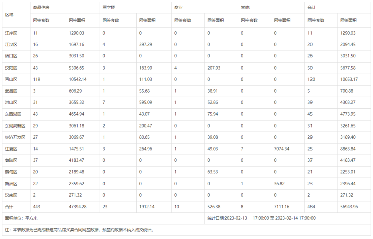 根据武汉市住房保障和房屋管理局数据显示,2023年02月14日武汉新建商品住房网签成交443套, 较昨日减少71套,环比下降13.8%。