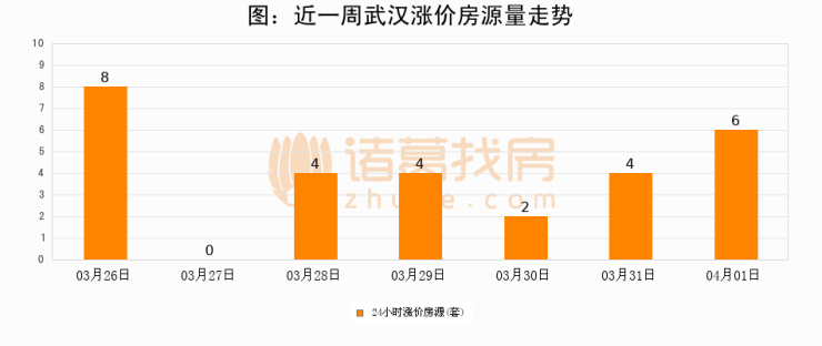 根据诸葛找房数据显示,武汉24小时涨价房源量为6套,较03月31日增加2套,环比上涨50%。与此同时,涨价房源占比小幅扩大,业主信心有所提升。