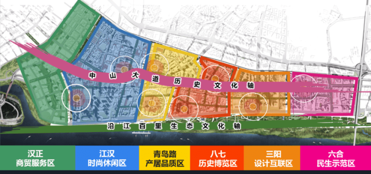 着眼于城市文脉,老城复兴,现如今的汉口历史风貌区江岸片被划分为“青岛路产居品质区、八七历史博览区、三阳设计互联区、六合民生示范区”四大主题产业片区。其中,青岛路片因保留着大量万国建筑与汉派民居存迹,成为产居品质区。未来这里将成为集“医疗、养老、文化”等多功能一体的邻里中心,以实现“15分钟生活圈”全覆盖。