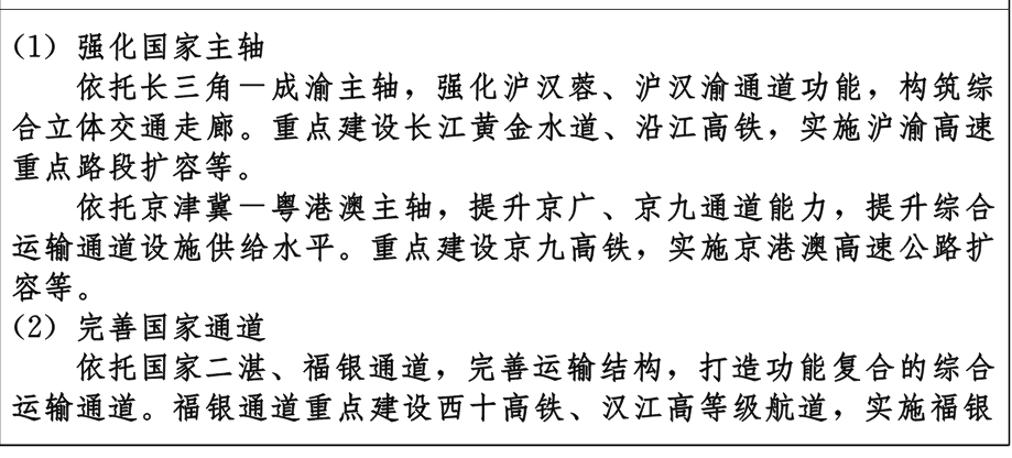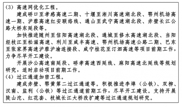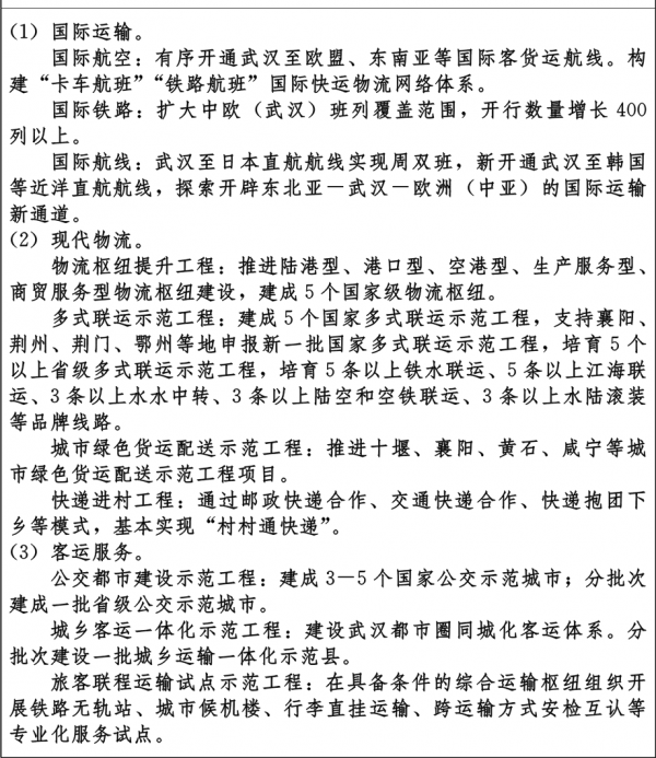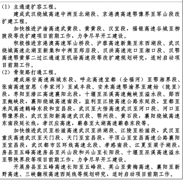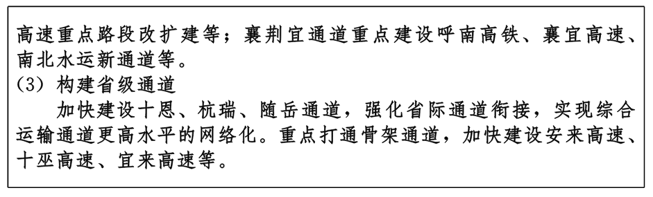 九通道:优化、提升、完善南北方向京九、京广、随岳、襄荆宜、十恩和东西方向福银、沪汉蓉、沪汉渝、杭瑞等“五纵四横”九条综合交通运输大通道。