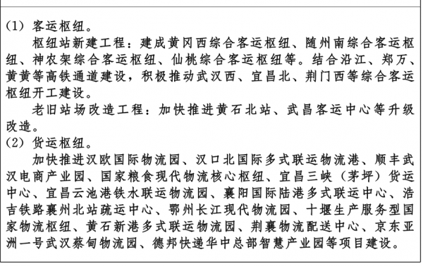 三枢纽:打造武汉国际性综合交通枢纽城市和襄阳、宜昌全国性综合交通枢纽城市。