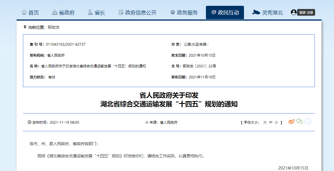 11月22日,搜狐焦点获悉,近日,《湖北省综合交通运输发展“十四五”规划》正式印发(点击下图查看全文)。