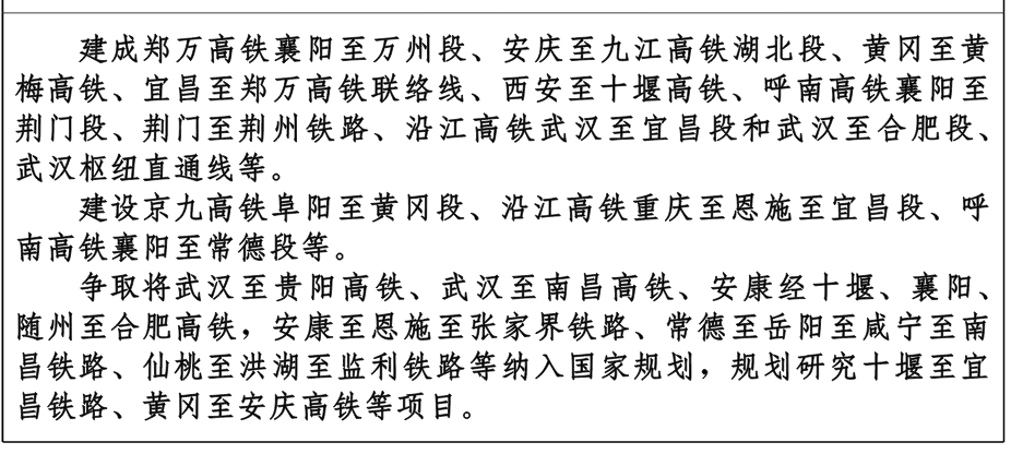 加快构建以武汉为中心的“米字型、十通向”高铁枢纽网,推动形成以襄阳、宜昌为中心的多向放射格局,实现高铁对全省所有市州的覆盖。