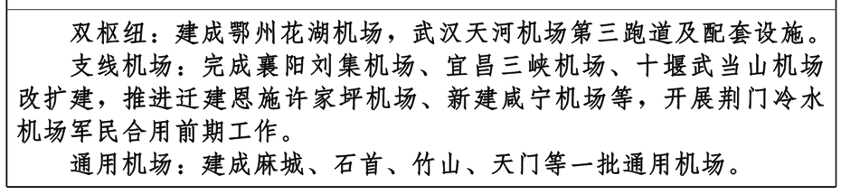 重点推进鄂州花湖机场建设,打造国内一流专业航空货运枢纽、全球主要航空物流节点;加快推进武汉天河机场提升改造,打造民航客货运门户“双枢纽”。积极推进改扩建和新建一批支线机场,规划建设一批产业基础好、市场需求旺盛的通用机场。