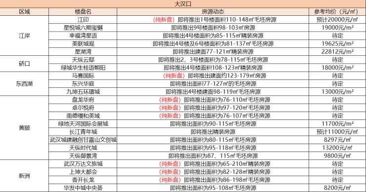 大汉口:大汉口7月入市最多的楼盘区域是黄陂及江岸,黄陂区均价较低,符合更多刚需购房者预期,而主城区的江岸片区供应量比较充足,预计5盘入市,总体来看,7月大汉口片区共出现9个纯新盘。
