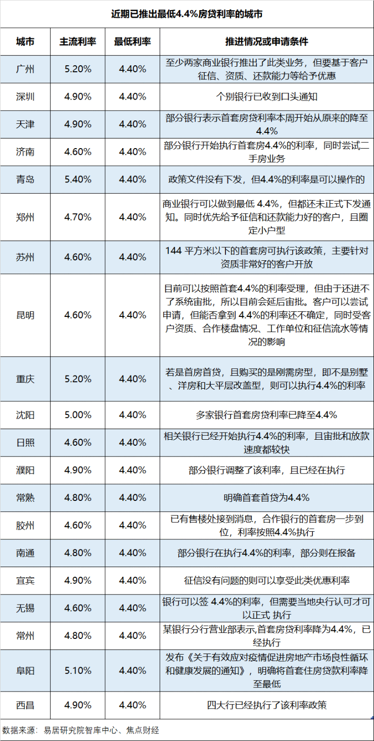 据易居研究院智库中心统计,广州、深圳、天津、济南、青岛、郑州、 苏州、昆明、重庆、沈阳、日照、濮阳、常熟、胶州、南通、宜宾、无锡、常州、 阜阳和西昌等20个城市均出现了4.4%的房贷利率。