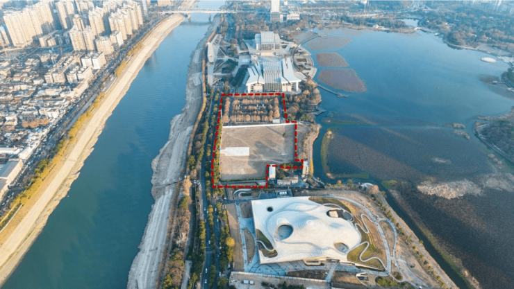 武汉戏曲艺术中心项目选址于琴台中央文化艺术区中心地带,北临知音大道,南抵月湖风景区,位于琴台大剧院和琴台美术馆之间。