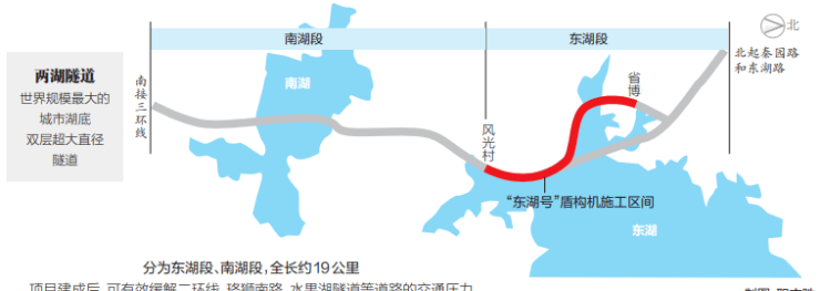 两湖隧道作为世界上规模较大的城市湖底双层超大直径隧道,是武汉市重点市政工程,也是惠及武汉千家万户的重大民生工程。项目建成后,将在武昌片区形成一条南北向快速通道,可有效缓解二环线、珞狮南路、水果湖隧道等道路的交通压力,不断完善区域路网体系,方便周边地区居民出行。