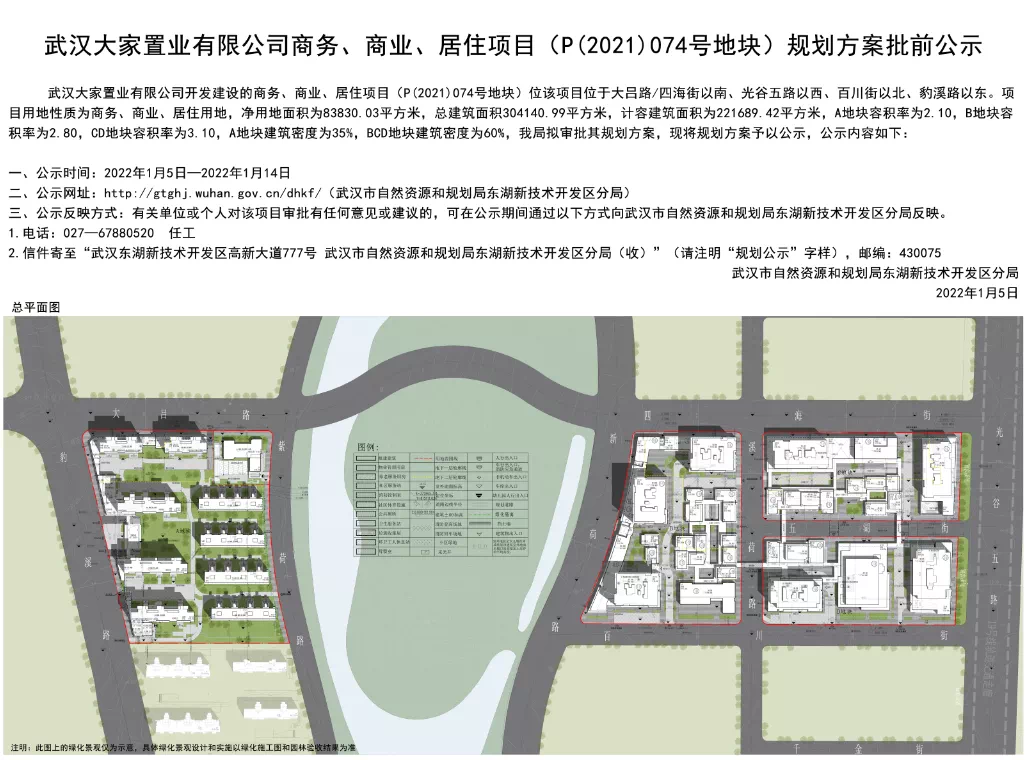 1月6日消息,搜狐焦点获悉,1月5日,武汉大家置业有限公司商务、商业、居住项目(P(2021)074号地块)规划出炉。项目地址位于大吕路/四海街以南、光谷五路以西、百川街以北、豹溪路以东。规划总用地面积186599.35㎡、规划用地性质:住宅、商服用地。据悉,该地块即P(2021)074号地块,今年6月25日,大家房产以8.97亿元竞得。