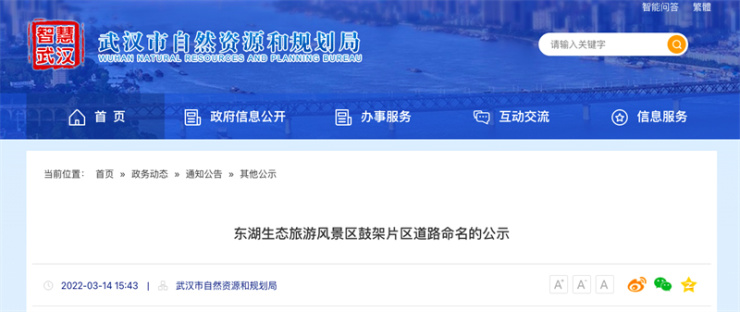 3月14日消息,搜狐焦点获悉,武汉市自然资源和规划局网站公示东湖生态旅游风景区鼓架片区14条道路的命名,公示时间2022年3月14日至2022年3月24日,公示意见请发至联系邮箱:LMGH@WPDI.CN。