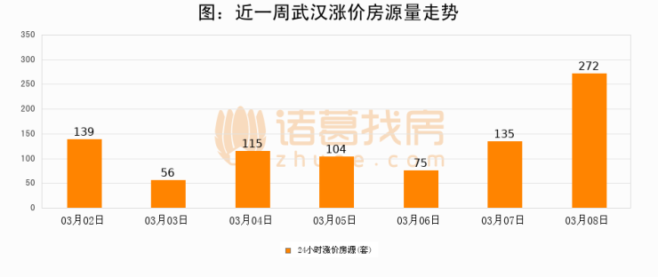 根据诸葛找房数据显示,武汉24小时涨价房源量为272套,较03月07日增加137套,环比上涨101.5%。与此同时,涨价房源占比小幅扩大,业主信心有所提升。