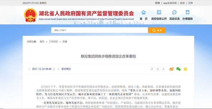 1月13日消息,搜狐焦点获悉,2021年12月22日,湖北省国有资产监管委员会发布公告称:联投集团开启国企改革重组。在12月6日下午,省委省政府召开省属国资国企改革推进会,由联投集团、湖北工建、清能集团、宏泰城发新组建的湖北联投集团有限公司成立揭牌。联投集团党委迅速贯彻落实会议精神,按照“聚焦主责主业,加快调整重组,加强风险防控,努力打造集园区开发运营、城市更新和建设施工于一体的现代企业集团”要求,认真研究部署,迅速稳妥推进相关工作,确保改革重组与生产经营两手抓、两不误、两促进,企业总体经营保持平稳健康发展。